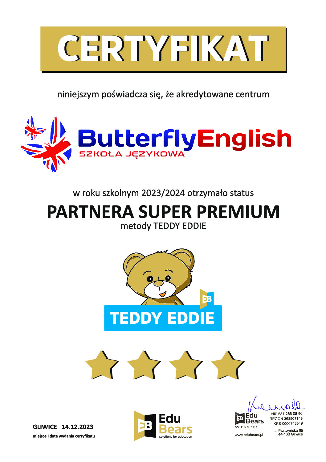 Tworząc Butterfly English chciałam, aby była to bezpieczna przestrzeń, która pomaga dzieciom rozwijać skrzydła. Dlatego po pierwsze stawiamy na indywidualne podejście do ucznia i na relację, dzięki czemu nauka odbywa się w sposób efektywny i dostosowany do potrzeb każdego naszego kursanta. Bardzo ważne dla nas jest, aby każde dziecko czuło się bezpiecznie i komfortowo. Poza kursami językowymi organizujemy półkolonie, warsztaty i obozy językowe gdzie budujemy wspaniałe relacje z naszymi podopiecznymi i zbieramy masę cudownych wspomnień :)